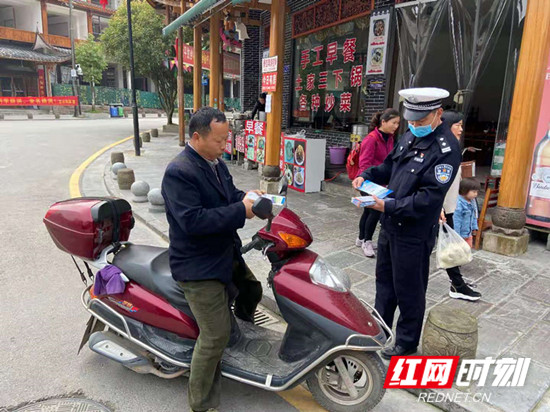红网时刻张家界12月22日讯(通讯员胡石友)“骑摩托车一定要戴头盔,防止意外发生!”“年末了,赶场一定要乘坐安全的车辆……”12月22日上午,在武陵源区天子山街道,交通民警正在沿路挨家挨户的进行冬季道路交通安全宣传。