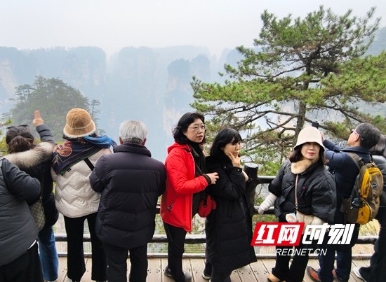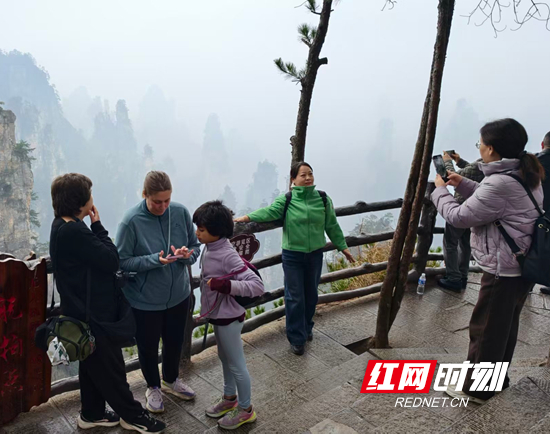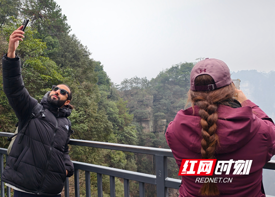 红网时刻新闻1月18日张家界讯(通讯员 吴勇兵) 1月18日,外国游客在湖南张家界国家森林公园游览。眼下虽是张家界国家森林公园冬季旅游的相对淡季,但在天子山、袁家界等景区,处处可见外国游客的身影。据介绍,新年伊始,张家界国家森林公园入境游开局良好,韩国、马来西亚、泰国、意大利等国家和地区的游客纷至沓来。