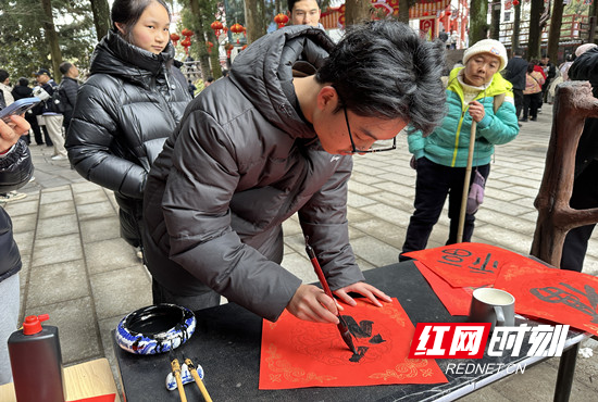 活动期间,管委会工作人员现场为游客手写福字免费赠送,墨香传福、年味十足。景区同时开放游客自主写福互动环节,大家既可将亲手书写的福字带走留念,也可留在现场传递给下一位有缘人,让新春福气在山水间接力。