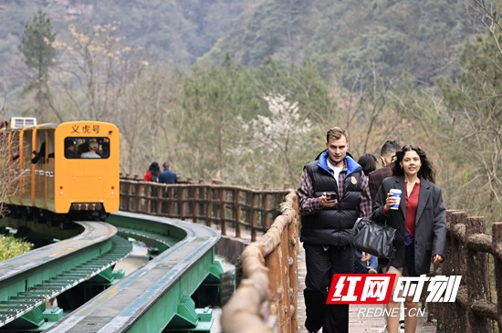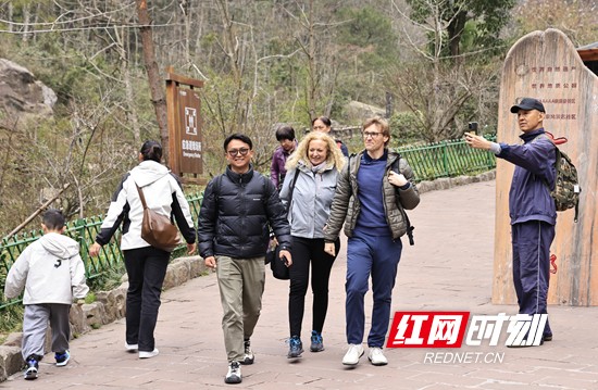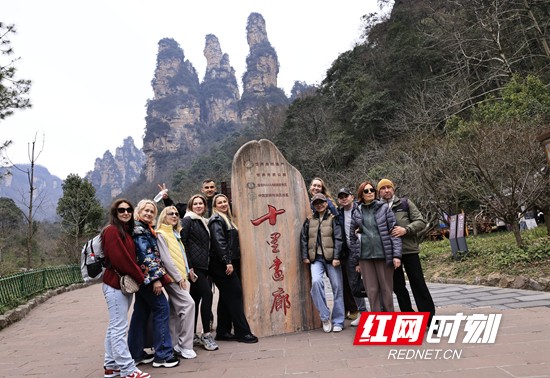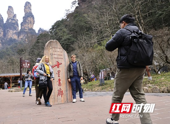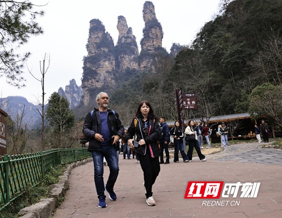 红网时刻新闻3月14日张家界讯(通讯员 吴勇兵) 3月14日,张家界国家森林公园十里画廊,春花烂漫,中外游客赏景游玩,乐享春日美好时光。今年以来,张家界国家森林公园入境游持续升温,作为核心游览线的十里画廊,成为外国游客游览的主选“菜单”。