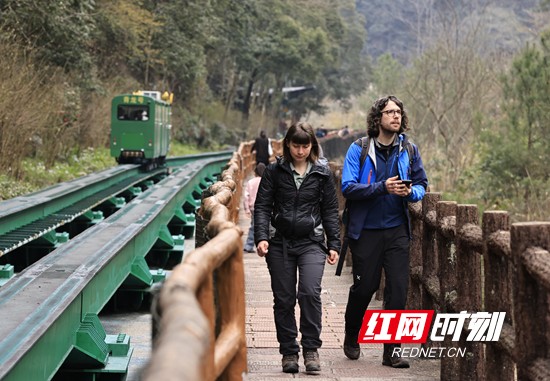 3月14日,外国游客在张家界国家森林公园十里画廊游玩。(吴勇兵摄)