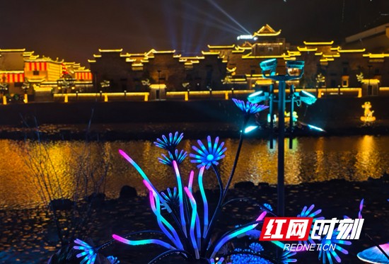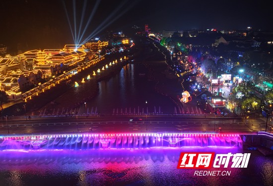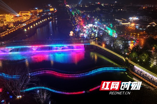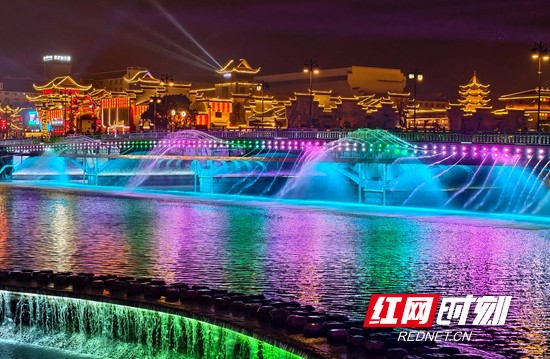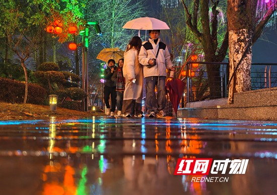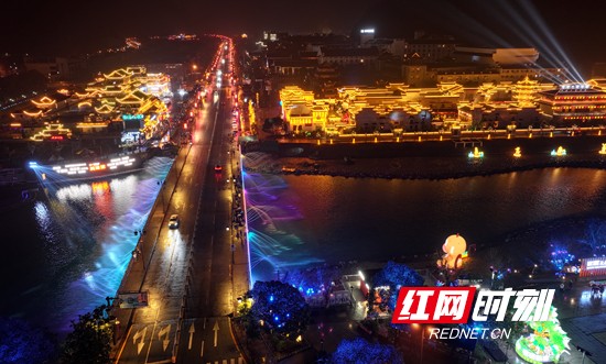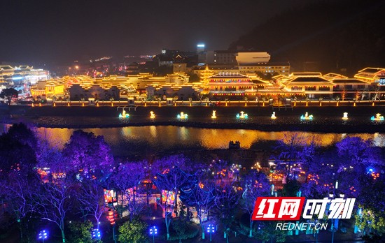 红网时刻新闻3月9日张家界讯(通讯员 吴勇兵)3月8日晚,雨夜中的湖南省张家界市武陵源区,灯光璀璨。暖黄灯笼与现代霓虹交织,相映成趣,河面倒映着流光溢彩的光影,将山城夜景装点得美轮美奂,尽显土家风情与山水夜游的魅力。