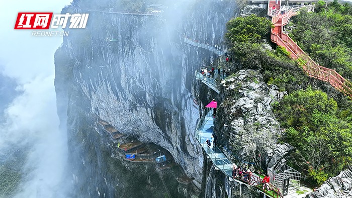 张家界七星山经历漫长雨期后,春意盎然,日前,山体被云海包裹呈现“天空之城”盛景,吸引众多外籍游客拍照打卡留念。作为网红打卡地“七星山飞拉达”更是成为全球游客争相体验的热门地标。