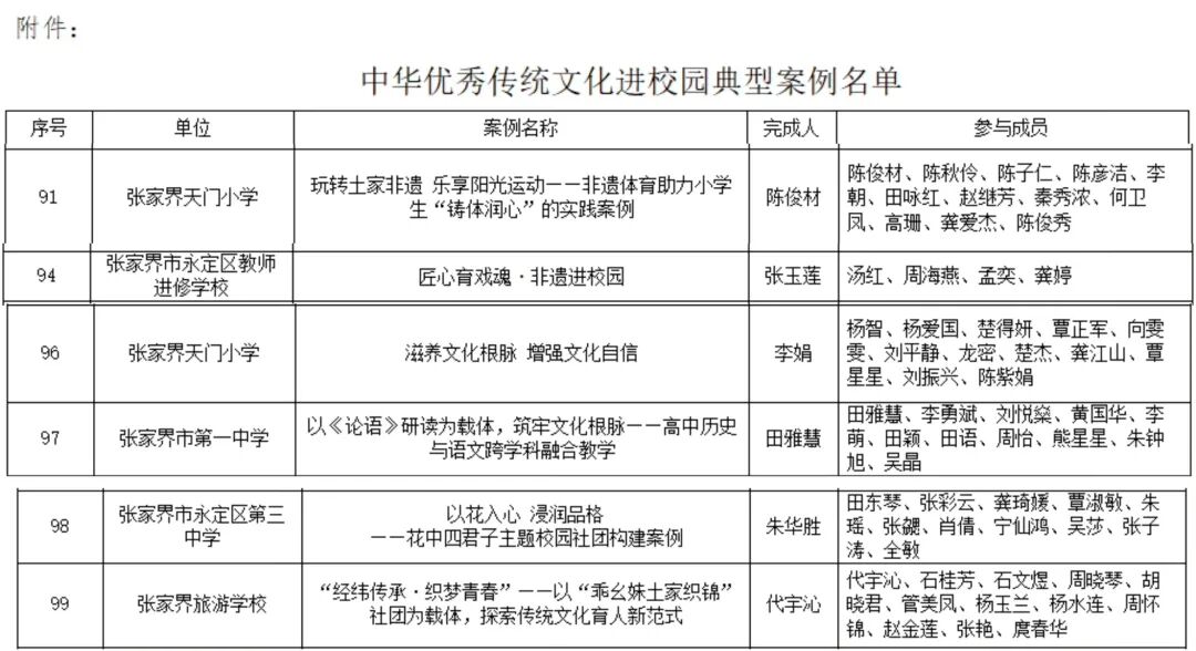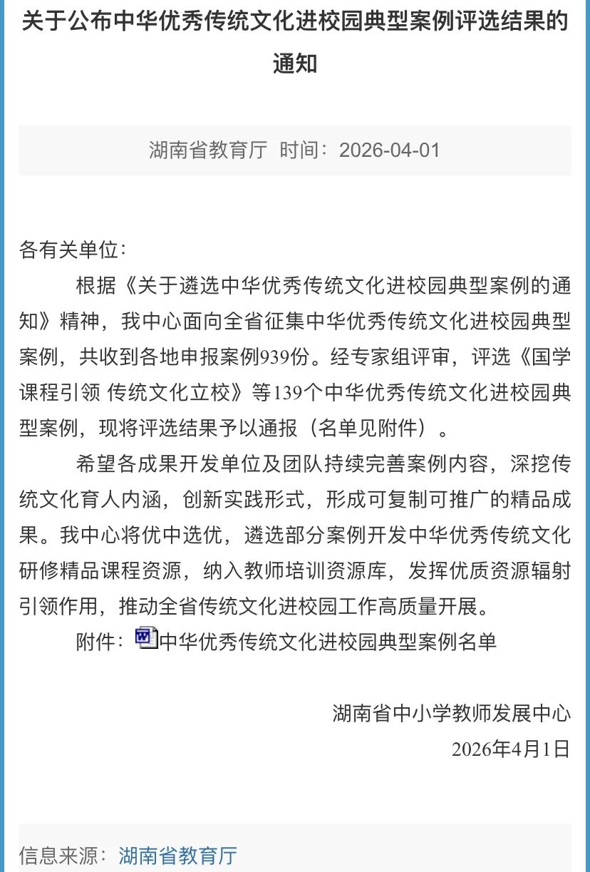近日,湖南省中小学教师发展中心公布中华优秀传统文化进校园典型案例评选结果,共评选出139个中华优秀传统文化进校园典型案例,永定区有6个案例入选,分别是张家界天门小学《玩转土家非遗 乐享阳光运动——非遗体育助力小学生“铸体润心”的实践案例》《滋养文化根脉 增强文化自信》,张家界市第一中学《以〈论语〉研读为载体,筑牢文化根脉——高中历史与语文跨学科融合教学》,永定区第三中学《以花入心 浸润品格——花中四君子主题校园社团构建案例》,张家界市永定区教师进修学校《匠心育戏魂・非遗进校园》,张家界旅游学校《“经纬传承·织梦青春”——以“乖幺妹土家织锦”社团为载体,探索传统文化育人新范式》