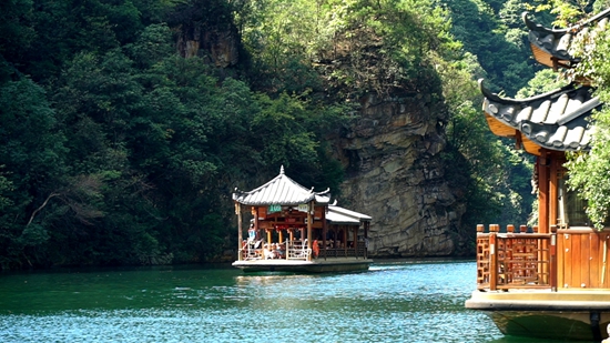 武陵源区融媒体中心5月23日讯(记者 王娇)“郎在高山哟打一望哟,姐在哟,河里哟,情郎妹妹哟衣也洗衣裳啰喂,哟儿喂……”宝峰湖碧波荡漾,山歌袅袅,身着绚丽民族服饰的土家阿哥阿妹立于船头,清亮婉转的歌声穿透湖面。游客们乘船而行,或静静聆听,或兴致勃勃地参与互动,一唱一和间,土家族的浪漫与热情扑面而来。