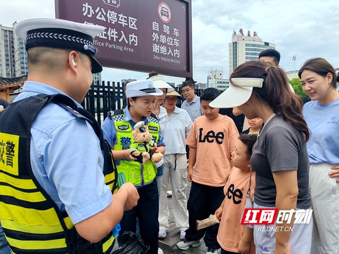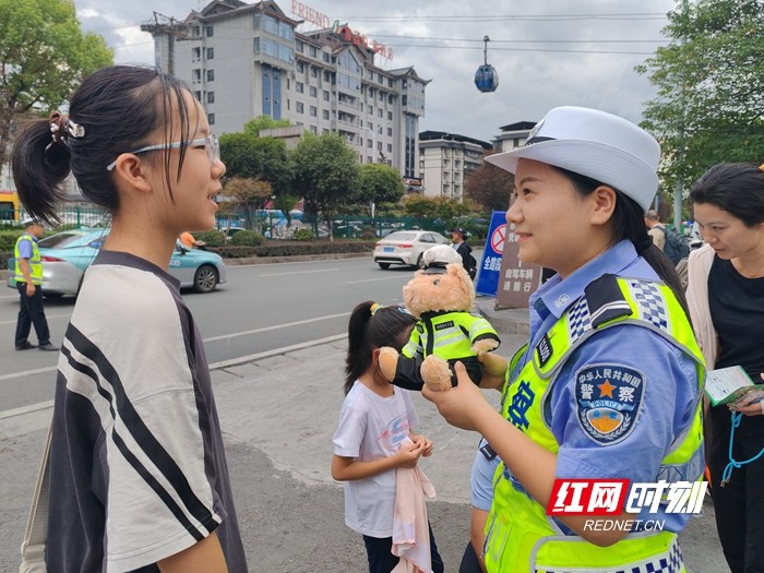 活动选址在张家界市天门山索道下站开展。活动中,交警在发放交通安全宣传资料的同时,热情邀请小游客围绕“过马路要走什么线”“乘车为什么要系安全带”“景区内能否随意横穿马路”“儿童乘车要坐什么位置”等与旅游和日常出行密切相关的知识点提问,答对即赠送交警小熊。