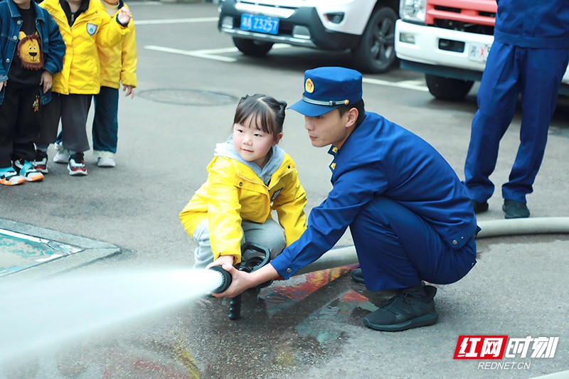 实操体验环节人气高涨。在指战员指导下,孩子们换上消防服变身“小小消防员”。此外,指战员通过实物演示讲解灭火器“提、拔、握、压”四字口诀,手把手教孩子们掌握使用方法。